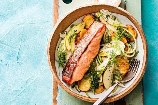 - Â Strain fennel mixture and discard liquid. Add dill. Season with salt and pepper. Toss to combine. Divide fennel mixture and potato among 4 bowls. Top with salmon and drizzle with dressing. Sprinkle with reserved fennel fronds. Serve.